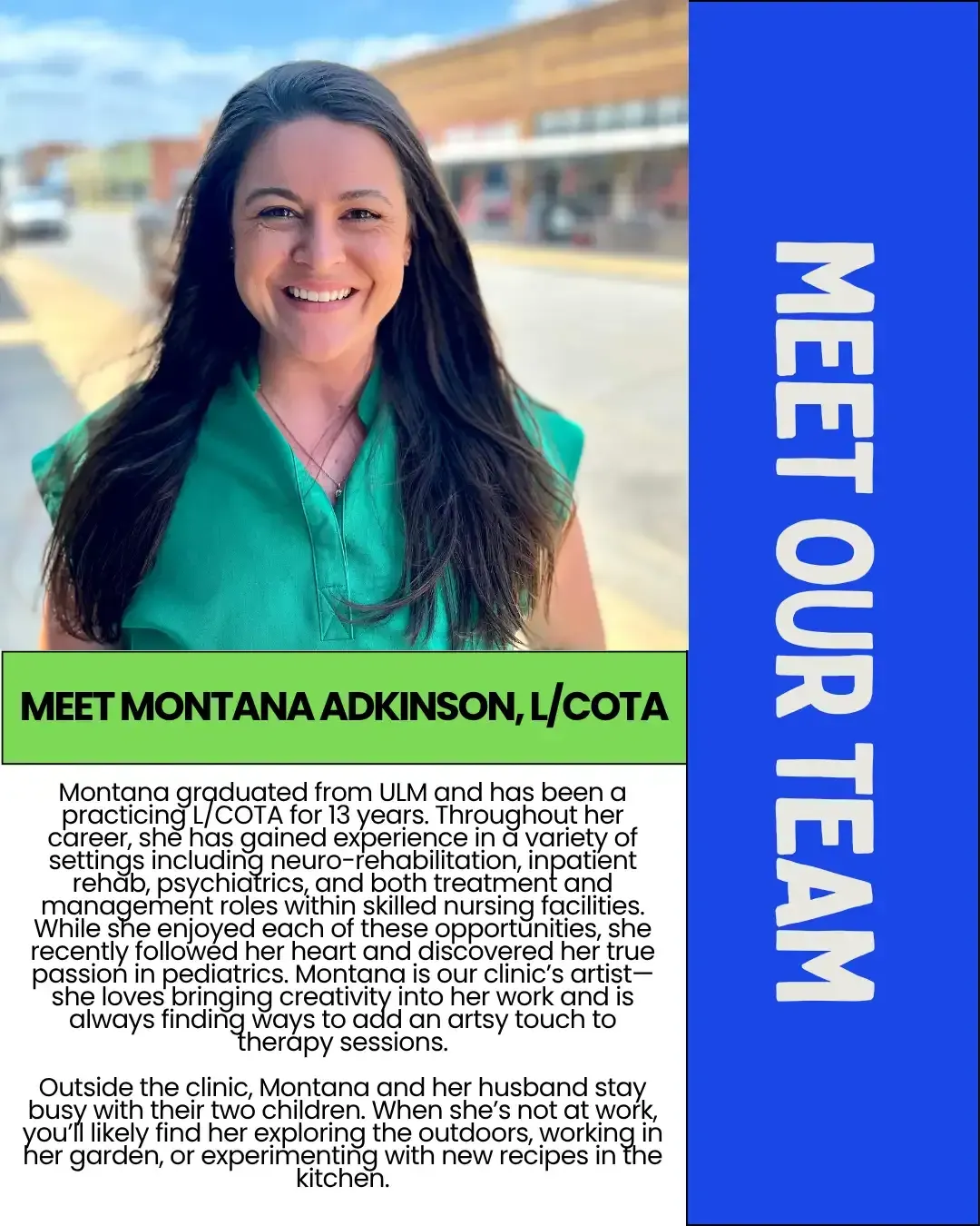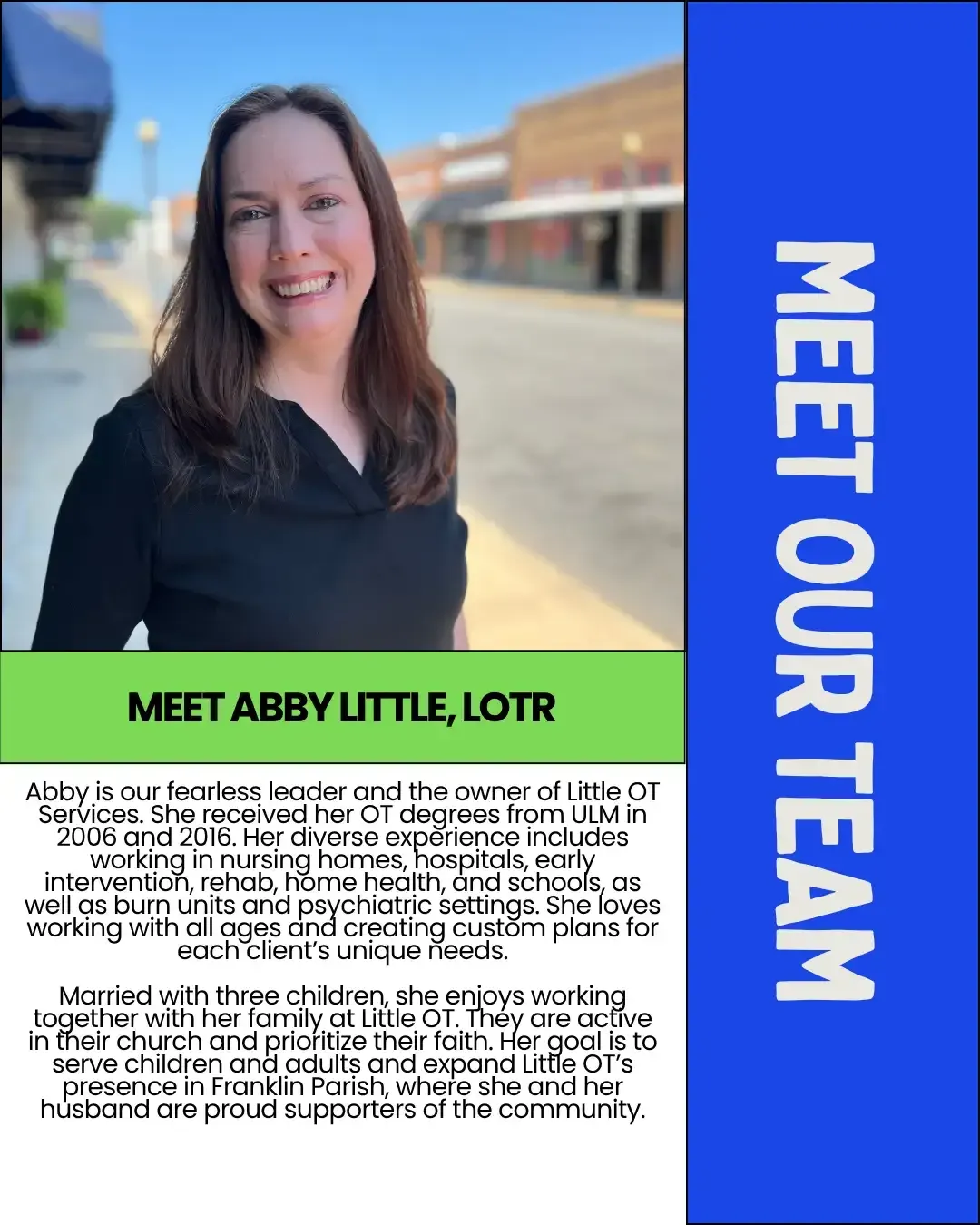 Married with three children, she enjoys working together with her family at Little OT. They are active in their church and prioritize their faith. Her goal is to serve adults and expand Little OT’s presence in Franklin Parish, where she and her spouse are proud to support the community.