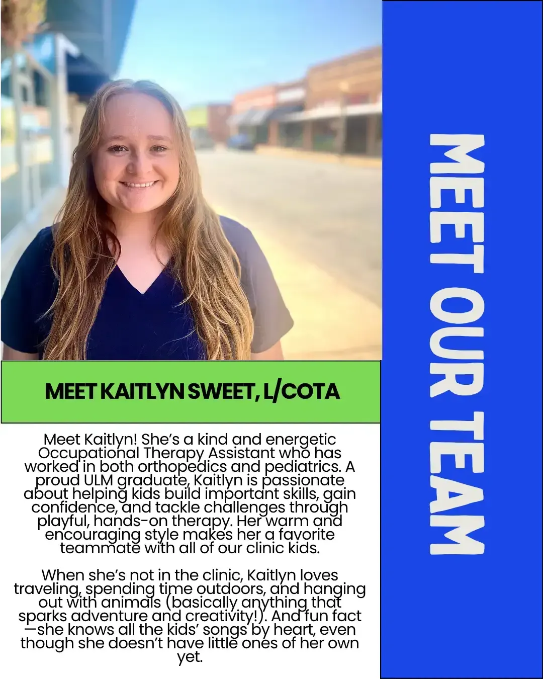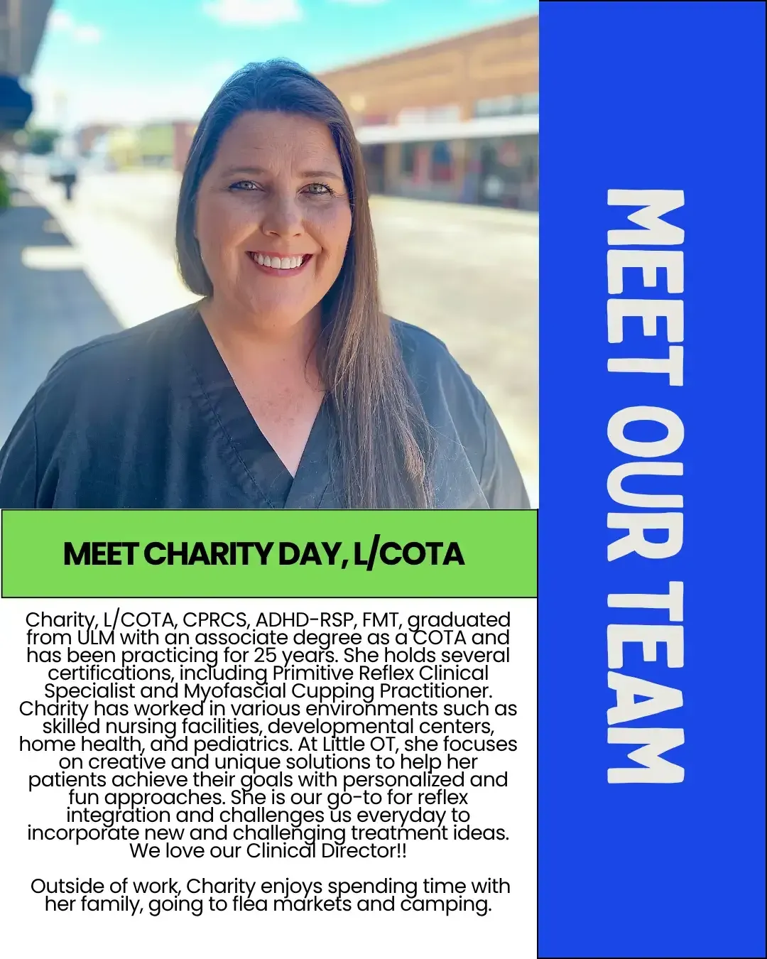 Charity, L/COTA, CPRCS, ADHD-RSP, FMT, graduated from ULM with an associate degree as a COTA and has been practicing for 25 years. She holds several certifications, including Primitive Reflex Clinical Specialist and Myofascial Cupping Practitioner. Charity has worked in various environments such as skilled nursing facilities, developmental centers, home health, and pediatrics.