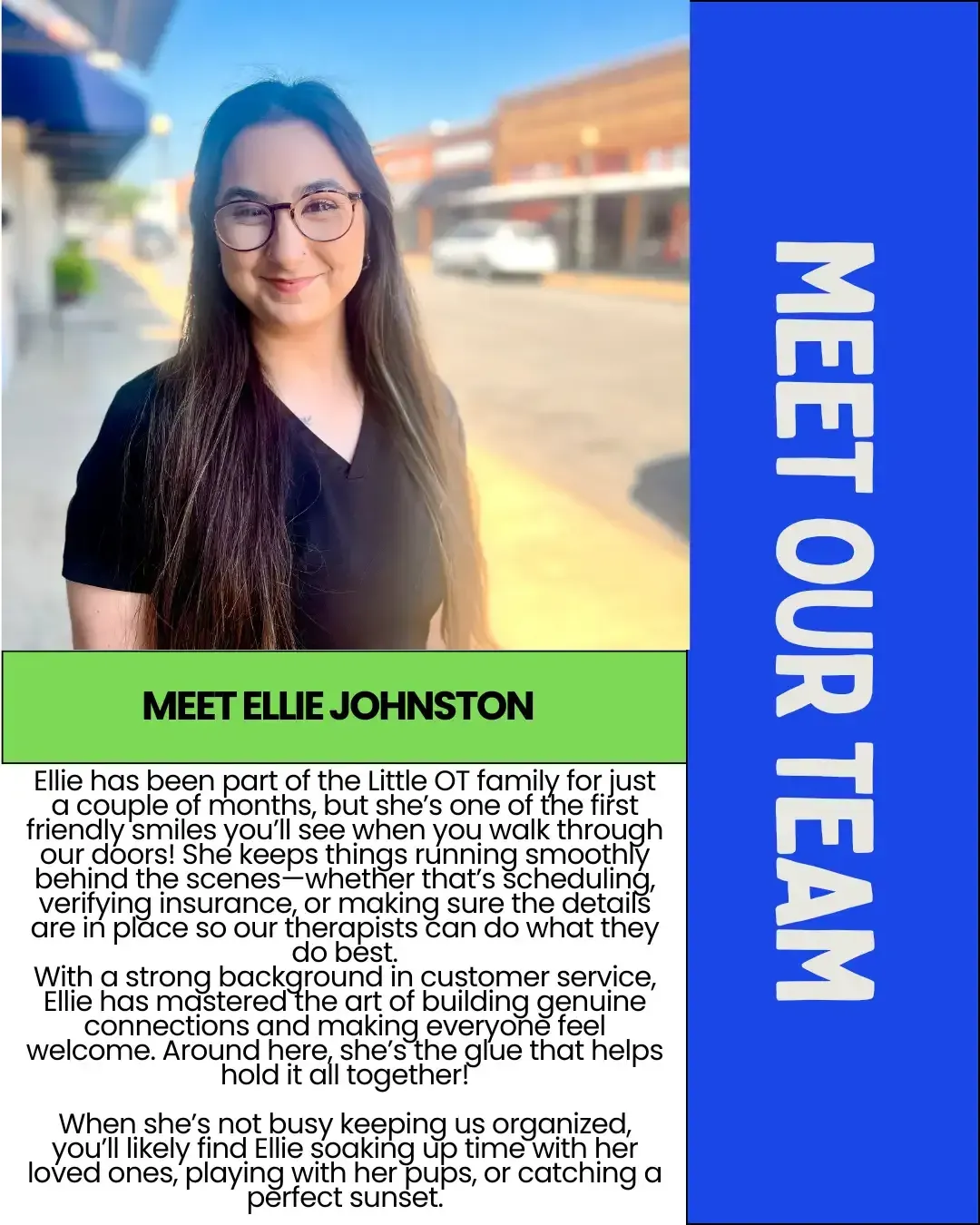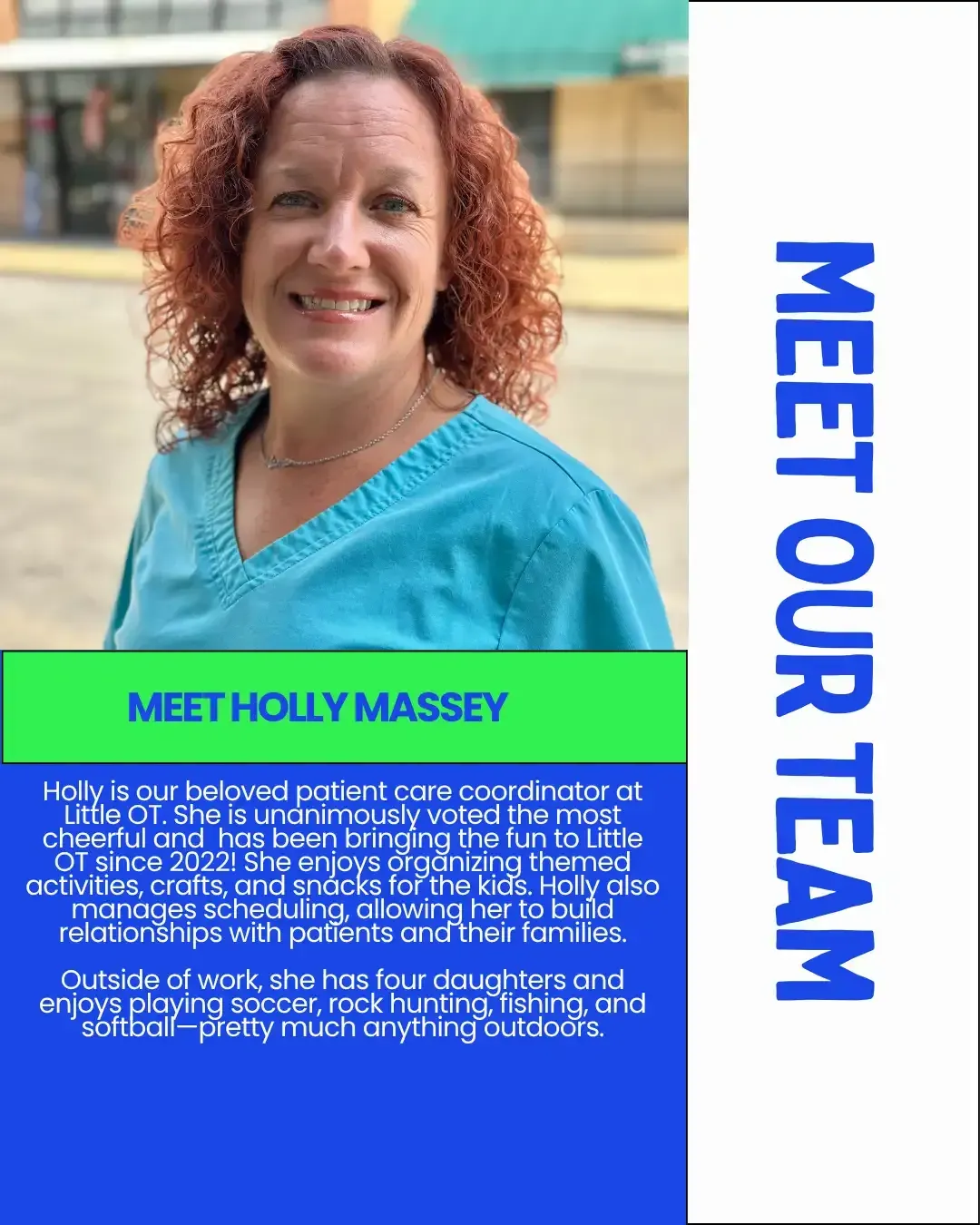 Holly is a patient care coordinator at Little OT with 2 years of experience in pediatrics. She enjoys organizing themed activities, crafts, and snacks for the kids. Holly also manages scheduling, allowing her to build relationships with patients and their families.