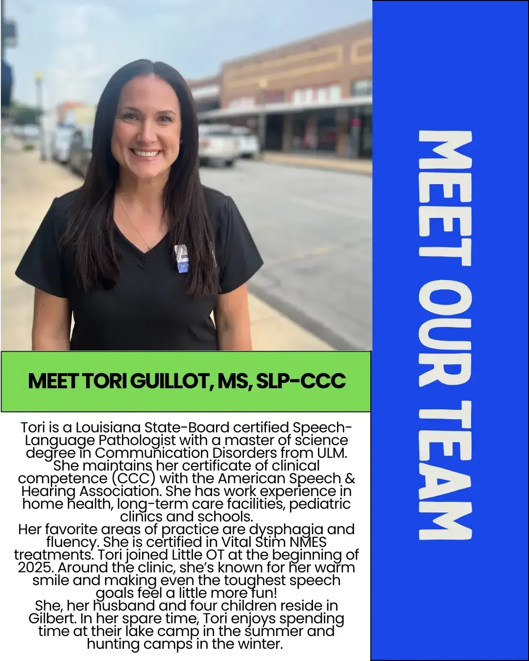 For over a year and a half, Erica has provided speech therapy at Little OT Services, where she enjoys the supportive and fun work environment. Recently, she received the Quality of Life Award for her work at Plantation Manor Nursing & Rehab. Erica resides in Mangham with her husband and three children. She is active in Mangham Baptist Church, serving on the Hostess Committee and teaching children’s church. In her spare time, Erica enjoys family time, reading, and watching Netflix.